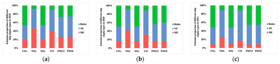 In terms of the proportion of emissions from different types of vessel engines, the POLB differs slightly from other ports. Emissions from ships within other ports are mainly from MEs, while emissions from the POLB are mainly from AEs and boilers. This is partly due to congestion in the port. Figure 5 illustrates the proportion of emissions from different types of engines for all types of ships.