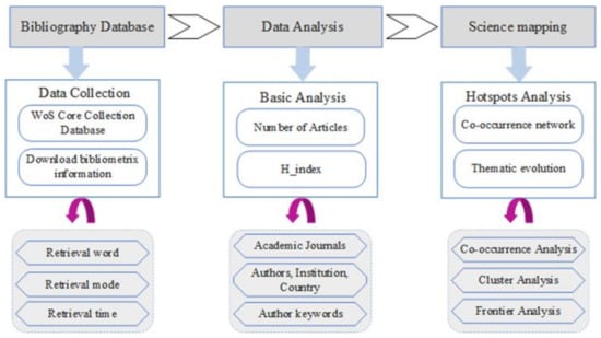 In this paper, the bibliometrix and biblioshiny software packages were used to analyze and visualize the research status and research trends in the field of LUCE. We used the core collection of Web of Science as a bibliometric database. We detected and drew the visual knowledge networks about the number of published and cited studies, research journals, authors, teams, institutions and countries, research keywords, and themes of LUCE research using bibliometrix. Based on the tools of co-occurrence analysis, cluster analysis, and thematic evolution analysis of biliometrix software, we identified the topic hotspots and research frontiers. Then, we presented the future directions of LUCE research. The flowchart of bibliometric analysis is shown in Figure 1.