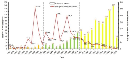 We analyzed the number of publications and citations in the field of LUCE research from 1992 to 2022 (Figure 2). The bar chart shows that the number of publications in the field of LUCE research has increased exponentially. The line chart indicates that the average citations per paper fluctuate. The LUCE research is roughly divided into three stages from 1992 to 2022 based on the above features: (1) Preliminary exploration stage (1992–2001), where the average number of publications per year is only 3.3, with an average number of citations per year of 326.0. This is the beginning stage of LUCE, with fewer articles and citations. During this period, international scholars mainly concentrated on research on forest carbon stock, forestry carbon emission reduction, and carbon emission dynamics due to land use change. These studies provide a solid foundation for subsequent research. (2) Problem-focused stage (2002–2011): the average number of publications per year is 20.2, with an average number of citations per year of 2327.9. Throughout the whole stage, the academic community paid greater attention to LUCE, transitioning from auxiliary research to an independent research topic. The number of publications grew, and the number of citations reached its highest. During this period, with the diversification of research methods and the maturity of research techniques, the research mainly covers the impact of global land use on the carbon cycle, carbon emissions from agroecosystems, carbon management in forests, biofuels, soil organic carbon, and other issues. (3) Prosperous development stage (2012–2022): the average number of annual publications is 77.91, while the average number of annual citations is 1951.42. As 2012 is a critical point in time for the end of the first commitment period of the Kyoto Protocol and the discussion of post-2020 measures to address climate change, the number of publications increased dramatically. In 2015, with the adoption of the Paris Agreement at the Paris Climate Change Conference, how to mitigate global warming by reducing land-use carbon emissions sparked widespread international interest. From the viewpoint of human activities, research on carbon emissions reduction and low-carbon optimization increased significantly and is still flourishing.