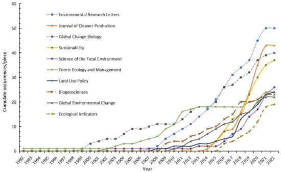 With the support of several prominent academic journals, the development of LUCE research can continue. We listed the top ten journals regarding the number of articles on LUCE research in Table 2. These journals have published 308 papers, representing 28.21% of all LUCE research publications. In terms of printed journals, the journal with the most published articles is Environmental Research Letters, with 50 articles, followed by the Journal of Cleaner Production and Global Change Biology, with 43 and 40 papers. The top ten journals are all high-quality journals with an average impact factor of 7.896. It indicates that the international mainstream academic community is paying more attention to the field of LUCE. In Figure 3, the cumulative number of articles in the field of LUCE in each journal over time is shown. Forest Ecology and Management was the first to publish a LUCE-related article in 1992, increasing from 1 in 1992 to 24 in 2022. Interestingly, the productivity of the journals was relatively weak until 2015, but then the production increased substantially between 2015 and 2022, especially the Journal of Cleaner Production and Sustainability.