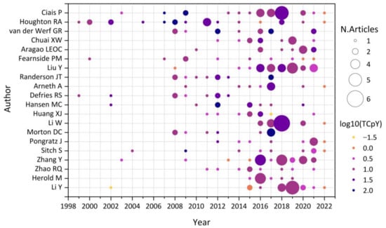 We listed the top twenty most influential authors in the field of LUCE research. Figure 4 shows that Houghton RA and Defries RS started their research on LUCE earlier, in 1999, demonstrating that they established the research’s theoretical foundations. Houghton RA published an article titled “Emissions of carbon from forestry and land-use change in tropical Asia” in Global Change Biology in 1999, which measured the net carbon emissions from forestry and land use change in South and Southeast Asia through a bookkeeping model [40]. This study is crucial for evaluating how human activity affects the global carbon cycle. In terms of total citations, Houghton RA has the highest total number of citations (7414); the paper “Use of U.S. Croplands for Biofuels Increases Greenhouse Gases Through Emissions from Land-Use Change” was published in Science in 2008, with 2967 citations. The study emphasizes the value of using waste as biofuels, arguing that an effective system must ensure the use of raw materials for biofuels (e.g., waste, carbon-poor land) [30]. In terms of the number of papers published, the top four authors are Ciais P, Liu Y, Houghton RA, and Zhang Y, with 22 papers, 21 papers, 20 papers, and 20 papers, respectively. The main research direction of Ciais P is historical CO2 emissions from land use/land cover change and its uncertainty, enriching the applied research of LUCE. Since 1998, authors mainly concentrated on Europe and the United States, and Chinese scholars began to pay attention to LUCE research in 2002. After 2008, the number of publications on LUCE research exploded, which indicates academics have widely valued LUCE research, which has inspired more influential studies.