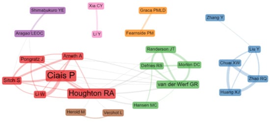 To understand collaborative communication between authors, we drew a collaborative network diagram of authors, which can reflect the composition of research teams. The distance and connection density between teams can reflect the intensity of cooperation among research teams, and the number of nodes in the teams can reflect their size. It can be seen from Figure 5 that the authors engaged in land-use carbon emission research have formed seven teams: Team 1 includes Ciais P, Houghton RA, Sitch S, Pongratz J, Arneth A, and other members. They concentrate on measuring carbon emissions from land use and land-cover change [41,42], carbon emissions from deforestation and fire [43], and the terrestrial carbon cycle [33]; Team 2 includes van der Werf GR, Randerson JT, Defries RS, Morton DC, Hansen MC, and other members. They focus on the estimation of global fire emissions [36], carbon emissions from biomass burning [44,45], fire emissions from deforestation in the Amazon Basin [46], and the role of forest loss in the global carbon cycle in South America [47]; Team 3 includes Huang XJ, Chuai XW, Zhao RQ, Liu Y, Zhang Y, and other members. They select China or a province as the study area, measure carbon emissions from land-use change and management [13] and its influencing factors [48], spatial and temporal changes in carbon footprint [49,50], and low-carbon land management effects [51]; Team 4 mainly includes Li Y and Xia CY. They contributed to the quantitative study of the spatial pattern of urban carbon metabolism [52], the impact of city size on carbon metabolism [53,54], and the integrated impact of land-use change on carbon balance [55]; Team 5 mainly includes Aragão LEOC and Shimabukuro YE. They estimate carbon emissions from deforestation and fire in the Brazilian Amazon through modeling [15,56]; Team 6 mainly includes Fearnside PM and Graca PMLD. They work on the impact of land-use change on global warming [57], the impact of land-use change on biomass and carbon fluxes [58], and the climate effects of deforestation in the Amazon region [59]; Team 7 mainly includes Herold M and Verchot L. They focus on emission trends and their uncertainties in the land use sector in the tropics [60], as well as the integrated monitoring of reducing emissions from deforestation and forest degradation [61]. Generally speaking, team cooperation is relatively scattered, and the degree of connection between the teams is relatively low. Overall collaboration among authors is infrequent, cross-national exchanges among authors are generally lacking, and there are few representative large-scale collaborative networks.