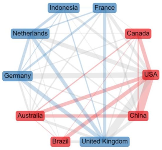 This paper creates a network of collaboration amongst the ten countries that have conducted the most research on LUCE to examine international collaboration and exchanges (Figure 7). We can draw two conclusions: (1) Australia, the US, the UK, and other nations engage in extensive international collaboration; and (2) European countries also have more opportunities for cooperation and communication on LUCE. The number of LUCE-related articles in European countries is equal to that in other countries, especially in the European Union (EU).