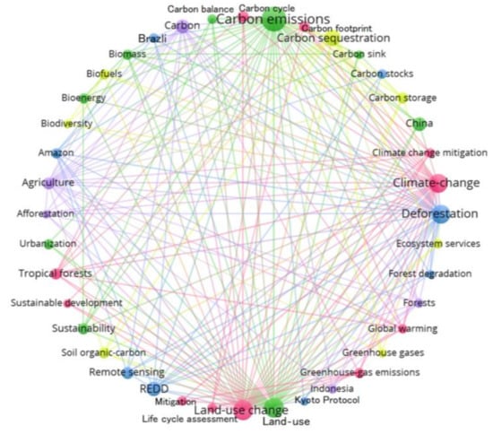 This paper conducted a cluster analysis of high-frequency keywords to examine LUCE research hotspots (Figure 9). It eventually obtained 40 keywords, forming five clusters. The larger the circle, the more frequently the keywords appear. We generated five clusters by using the keyword clustering function, and each cluster represents a LUCE hotspot. Among them, the most commonly appearing keywords are Land-use change, Carbon emission, Deforestation, Carbon sequestration, and Agriculture. It indicates that these five are the hotspots of LUCE research, and the core research contents of these five hotspots are specifically described below.