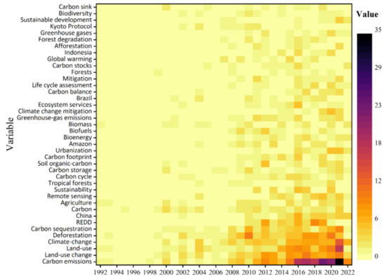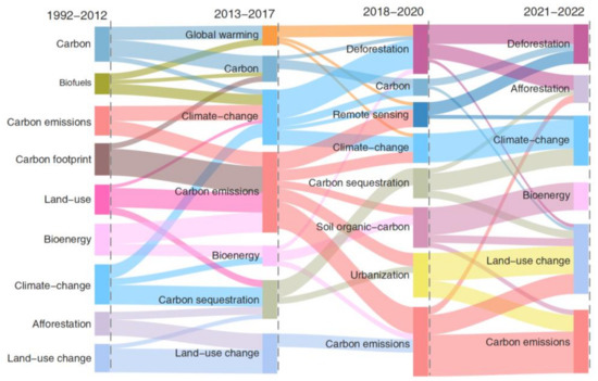 Land-use change (1992–2012)—Carbon sequestration (2013–2017)—Remote sensing (2018–2020)—Carbon emissions (2020–2022): Land-use change has been recognized as a global concern, and land use patterns controlled by human activities lead to changes in their land use types that affect global greenhouse gas emissions and soil carbon stocks. Land-use change plays a critical role in global carbon dynamics, and implementing effective land use management to increase soil carbon stocks is an effective means of mitigating atmospheric CO2 levels. The most common method for monitoring land-use change is remote sensing, which can provide continuous and spatial estimates of aboveground biomass, which is valuable for analyzing and quantifying carbon stocks and emission factors and has become a helpful tool for tracking carbon emissions. Currently, many academics use remote sensing techniques to evaluate carbon emissions from wildfires [15] to measure and track the dynamics of forest carbon stocks [89], biomass burning emissions [36], drivers of tropical deforestation [100], and other research areas. Remote sensing satellite data can also track historical variability, and its availability has dramatically expanded the ability of researchers to track past carbon emissions data. Advances in remote sensing technology have led to the broader application of satellite data in the field of carbon emissions. Therefore, further research should use remote sensing satellite data for large-scale analysis; for instance, to calculate the carbon storage capacity of the world’s vegetation, map the habitat of blue carbon, and determine the potential for carbon sequestration. These studies are essential for establishing global carbon monitoring and supporting nations in achieving the Paris Agreement and IPCC emission reduction targets.