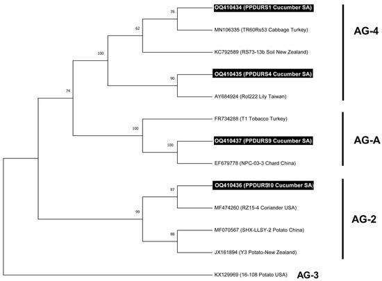 Ten R. solani isolates were recovered from cucumber plants with infected roots (Figure 1a,b) which were collected from various commercial greenhouses in the eastern area of Saudi Arabia between September and April 2021. Ten isolates of R. solani were recovered from the roots of cucumber plants with a frequency which reached 95–100%. Microscopic examination revealed that nine isolates were multinucleate while one isolate was bi-nucleate. Eight isolates belonged to the AG-4 anastomosis group, while one isolate was AG2-1. The only binucleate isolate was AG-A (Figure 1c–g). Blast analysis of the obtained sequences against known sequences of R. solani AGs from NCBI GenBank confirmed that eight R. solani isolates belonged to the multinucleated AG-4 group, which showed 99.07% similarity to R. solani (Accession No. OQ357845) (Figure 1d). Further, the isolate PPDURS10 (Figure 1e) showed 99.8% homology with R. solani (AG2-1) (Accession No. MF474260), and PPDURS9 was a binucleated cell (Figure 1c) and showed 100% homology with R. solani (AG-A) (Accession No. OQ410437). The ML tree derived from the ITS sequences revealed a distinct differentiation between anastomosis groups of R. solani (Figure 2). The isolates attained in the current study and those retrieved from GenBank (Table S1) were categorized into three major groups with strong bootstrap values (99–100%). Based on the ML analysis (Figure 2), eight R. solani isolates (Figure 1d,f) belonged to the multinucleated AG-4 group. In contrast, the isolates PPDURS9 (Figure 1c,g) and PPDURS10 (Figure 1e,g) of R. solani belonged to the binucleated AG-A and AG2-1 groups, respectively. Only two representative R. solani (AG-4) isolates (PPDURS1 and PPDURS4) and the PPDURS10 and PPDURS9 isolates were deposited in the NCBI database (Table 1 and Table S1).