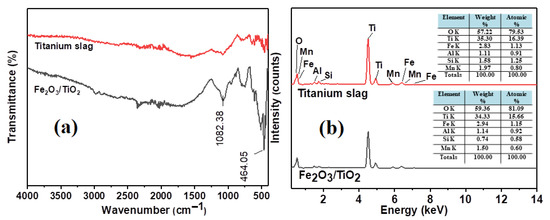 (a) FT−IR ATR spectra and (b) EDX spectra of the titanium slag and the Fe2O3/TiO2 composite (C20) calcined at 600 °C for 3 h.