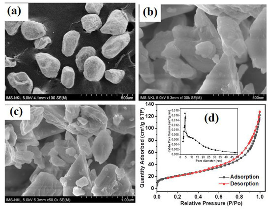 The surface morphology of titanium slag and Fe2O3/TiO2 composite was investigated by using scanning electron microscopy, and the result is shown in Figure 3a–c. Titanium slag is in the form of microparticles with diameters ranging from 100–400 µm (Figure 3a). After calcination and ball milling, the particle size distribution of the Fe2O3/TiO2 composite was significantly decreased to 50–500 nm (Figure 3b,c). The nitrogen adsorption–desorption isotherm and pore size distribution of the Fe2O3/TiO2 composite (C20 sample) are shown in Figure 3. According to IUPAC classifications, the adsorption isotherm displays a type IV and an H3 hysteresis loop in the relative pressure range of 0.5 to 1, which suggests that the material is mesoporous [34]. The BET surface area of the Fe2O3/TiO2 composite was determined to be 75.65 m2/g. The pore size and pore volume were calculated using the BJH method and are equal to 6.22 nm and 0.18 cm3/g, respectively.