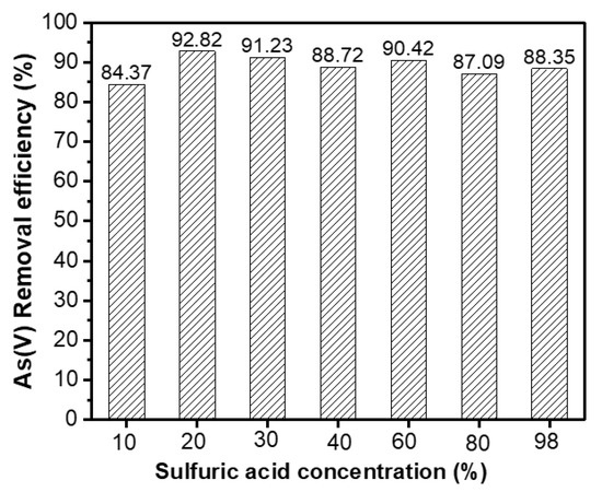 In a typical experiment, 100 mg of each of the samples—C10, C20, C30, C40, C60, C80, and C98, which refer to different concentrations of sulfuric acid—was mixed with 50 mL of 10 mg/L arsenic in a glass vessel. The mixture was shaken on an orbital shaker at a speed of 100 rpm at room temperature for 8 h and at a solution pH of 7. Then, all samples were filtered via vacuum filtration to remove the adsorbent, and the concentration of arsenic in the residual solutions was analyzed to investigate the effect of the sulfuric acid concentration.