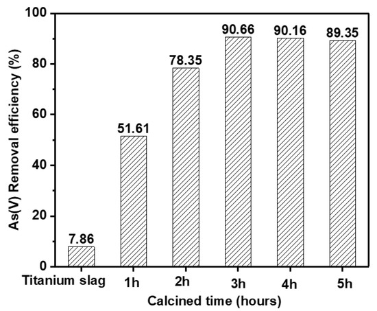 Figure 5 shows the effect of the calcining time at 600 °C on the adsorption efficiency of the composite toward As(V). It can be seen from the figure that the removal percentage of As(V) increases along with the calcination time of the titanium slag. Without a calcination process with sulfuric acid, the titanium slag exhibited a removal percentage toward As(V) ions of only 7.86%. After 1 h of calcination, the As(V) adsorption was significantly increased to 51.61% and reached a maximum value of approximately 91% after 3 h of calcination. Further increase in the calcination time caused a negligible decrease in the removal percentage of As(V). Thus, a calcining time of 3 h was selected as the optimum calcination time for preparation of the Fe2O3/TiO2 composite as an adsorbent for the removal of As(V).