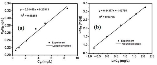 where KF (mg/g) is the Freundlich constant and n is the heterogeneity factor. The respective slope and intercept values of the linear plot of Ce and Ce/qe and lnCe vs. lnqe were utilized to determine the isotherm parameter values, which are shown in Figure 7, and adsorption isotherm parameters are presented in Table 2.