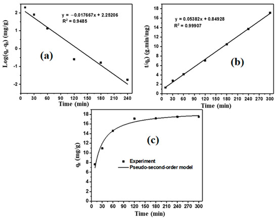 (a) Pseudo−first− and (b) pseudo−second−order kinetics and (c) the experimental and calculated data from the pseudo-second-order kinetic model for the As(V) removal.