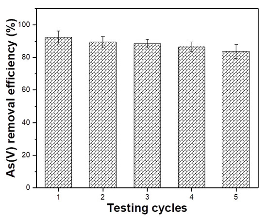 A testing column 2 cm in diameter and 10 cm in height was utilized to study the reusability of the TiO2/Fe2O3 composite for the As(V) removal. In total, 200 mg of the composite was filled into the column. The testing process was implemented with 10 mL of 10 ppm As(V) solution at pH of 7. After the first adsorption cycles, 30 mL of a 2M NaOH solution was used to thoroughly rinse the filter column to regenerate the composite for the next recycling test. The experiment was repeated for five cycles, and the result is exhibited in Figure 9. It is obvious to conclude from Figure 9 that the TiO2/Fe2O3 composite is durable with high recyclability toward As(V) adsorption and a negligible decrease in the removal percentage (<10%) after five testing cycles—from 92% for the first cycle to 86% for the fifth cycle—implying that the TiO2/Fe2O3 composite could be employed as an effective adsorbent for the removal of As(V).
