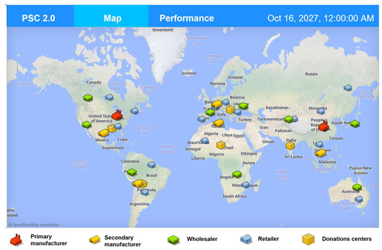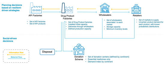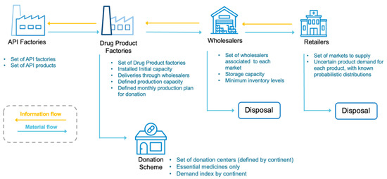 In the secondary manufacturing stage, the final drug product is produced, based on the API provided by the primary manufacturers. This step usually involves combining the API with other non-therapeutic ingredients, further processing of the formulation into a particular dosage form, and then packaging to ensure integrity and prevent deterioration during commercialization [10]. Because this manufacturing process is often less complex and with reduced lead times, secondary manufacturers are more responsive to market changes and, therefore, are often located closer to the markets, adopting a Make-to-Order strategy [30,31]. Moreover, we will consider that, as part of their social responsibility activities, the secondary manufacturers implement a “donation program” [32]. In that sense, a pre-defined percentage of the monthly production at the secondary manufacturers is directed for donation centers. The donation centers are characterized by a product demand that depends on the product type and on the specific needs for that product at the moment the product is available.