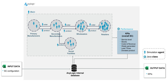 The simulation model was developed as an extension of the authors’ previous work [11], using the AnyLogic software as shown in the conceptual framework presented in Figure 3.