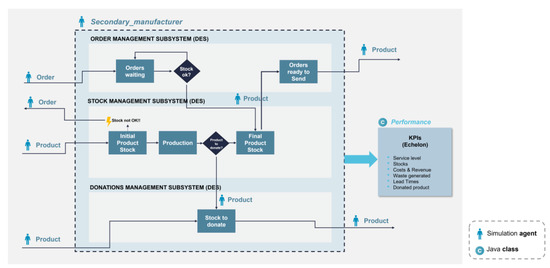 The first of these subsystems is responsible for managing incoming and outgoing orders; the second subsystem handles inventory management; and finally, a third subsystem implements the donation scheme. This third subsystem is exclusive to the secondary manufacturing facility agent, as depicted in Figure 4.