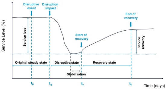 Service level typical behavior in the presence of a disruptive event (adapted from [37]).
