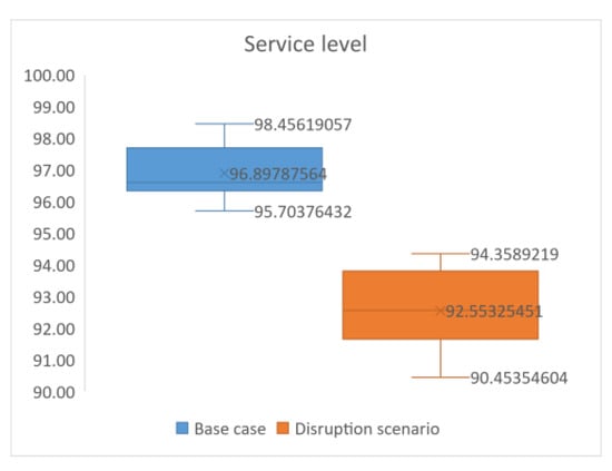 First, a “base case” was created, intended to be representative of a pharmaceutical supply chain with the general configuration of Figure 1. To this base case, a disruption scenario was “applied”. This disruption scenario tries to replicate a possible realistic scenario, in a pharmaceutical supply chain, where an accident in a secondary production plant forces operations to stop for a year. As the results presented in the next section show, this disruption scenario will result in a decline in the overall supply chain service level. As a mitigation measure, trying to decrease these negative effects on the service level and to increase the system resilience, we will increase the safety stock and assess the resulting effects on the several KPIs.