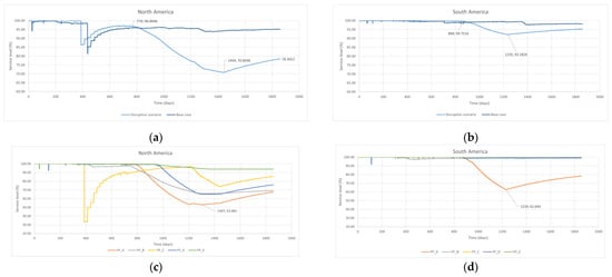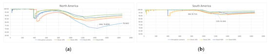 Service-level time for the disruption scenario with no mitigation measure (lighter blue), and with safety stocks of 10% (orange), 20% (yellow), 40% (darker blue), and 60% (green). (a) North American markets; (b) South American markets.