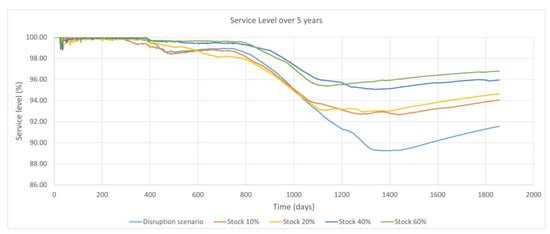 Second, increasingly higher stock values also decrease the duration of the disruption state, anticipating the start of recovery (tr). This anticipation also translates into decreased service loss. On the other hand, the start of the disruption state (td) is not significantly affected by the stock increase. For instance, increasing the safety stock to 60% pushes the beginning of the disruption state by 11 days, decreases its duration by 309 days, and decreases service loss from 9.5% to 4.2% in the overall SC.
