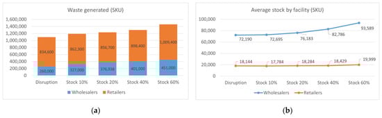 (a) Waste generated by wholesalers and retailers, for each of the mitigation scenarios; (b) average stock at each retailer and wholesaler facility, for each of the mitigation scenarios.