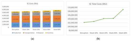 Overall supply chain costs at the end of the 5-year horizon, for each scenario: (a) in terms of manufacturing costs, transportation costs, disposal costs, and inventory holding costs; (b) total costs of the entire supply chain.