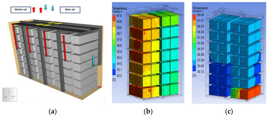 Temperature distribution of energy storage power supply with single means of forced air cooling. (a) Illustration of supply air cooling flow channel for the battery system; (b) The temperature distribution at battery of the uneven temperature; (c) The temperature distribution at battery of the high temperature.