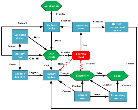 According to the process of function analysis in TRIZ theory, the engineering system should first be identified by components analysis. The system is formed of nine components, including the battery management system, the temperature sensor, the air inlet device, the air outlet device, the battery box, the module bracket, the battery module, the copper row, and the connecting terminal. Secondly, the interaction between each of the two components should be analyzed. Furthermore, the functional model is built, as shown in Figure 3.
