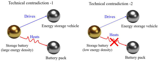 In order to clarify the direction of problem-solving, one of the technical contradictions is selected to be solved, as illustrated in Figure 4. The evolution trend of the S-curve in TRIZ theory can be helpful in analyzing the evolution direction of products. Judging from the performance parameters, number of invention patents, the patent level, profit, and other indicators, the energy storage power supply products should be at the second stage of the S-curve. TRIZ theory has given the product development strategy of this stage, which is that optimization is the main method to develop a technical system. For the energy storage battery, the energy density still needs to be improved. Therefore, technical contradiction-1 is selected for a solution; that is, the energy density of the energy storage battery is improved, then the power of the energy storage rail vehicle is sufficient, but the heat generated by the battery module is large, and the safety performance is reduced.