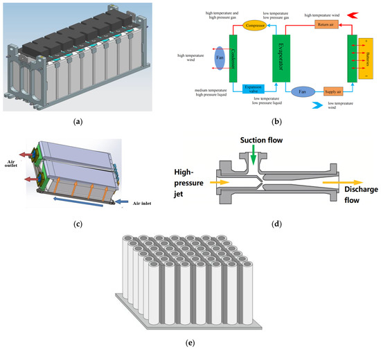Scheme 6: High-pressure jet device of the battery module can be used, as shown in Figure 5d. The core reason for heat dissipation in this scheme is the introduction of the high-pressure jet field inside the module. Specifically, the gas is compressed, and the negative pressure can be generated when the high-pressure gas passes through the variable cross-section nozzle of the jet ejector. It can lead to the increment of the cooling medium flow inside the battery module, the reason of which is that the airflow outside the module can be siphoned to the inside of the jet ejector.