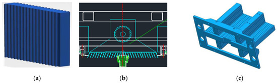 The schematic diagrams of the schemes. (a) The fin heat dissipation device of the battery module; (b) The structure of the radial flow deflector; (c) The orthogonal nested deflector of the battery module.