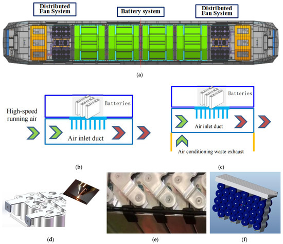 However, the energy density of energy storage batteries has been continuously improved with the steady development of energy storage rail vehicles, and problems of battery temperature increase and safety have become increasingly prominent. An energy storage system has high energy density, high power, and high heat generation, and the working temperature of the battery must be within the optimal temperature range to avoid battery overheating, fires, etc. [3]. Meanwhile, when the energy storage power battery is overloaded and overcharged, overheating can easily cause the battery to experience violent chemical reactions, produce a large amount of heat, and may lead to battery leakage, deflation, smoke, fire, and violent combustion resulting in explosions [4]. Therefore, the heat dissipation problem of rail vehicle traction power energy storage has become an urgent problem that needs to be solved for the large-scale application of energy storage power rail vehicles [5].