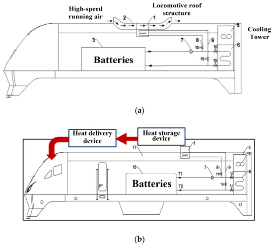 - Ke, Y.; Qiang, L.; Yejun, M.; Maohua, Z.; Tianzhi, Y.; Shilin, L.; Shimin, L.; Li, X.; Sheng, Y.; Shiwen, C.; et al. A Rail Vehicle Heat Dissipation System. Z.L. Patent 202110076356, 3 November 2022. [Google Scholar]