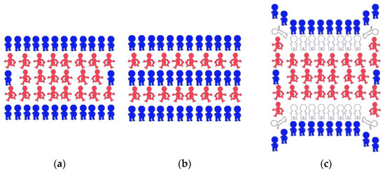 In order to obtain more conceptual solutions for screening, ARIZ should be used to continue the analysis. The problem could be solved by the method of small smart people, which is an important thought tool of TRIZ theory that can effectively break the inertia of thinking. As shown in Figure 11, the battery module is represented by the blue small smart people, and the heat is represented by the red small smart people. The establishment of the problem model is shown in Figure 11a. After personification, the scenario can be described as the red people needing to escape from the surrounding of the blue villain, and the space surrounded by the blue people is too small, which directly leads to the red people being more crowded when escaping.