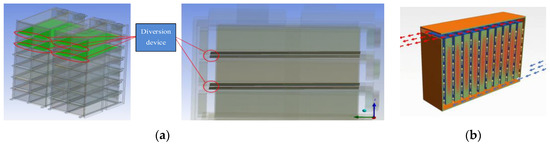Schematic diagrams of the schemes. (a) Multi-layer air diversion device; (b) Battery module diversion structure.