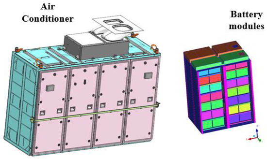 Finally, the final design scheme can be obtained by the overall consideration of the four analyzed design directions and the ranking of the ideality. The schemes with the higher ranking of the ideality in the determined types 1, 2, 3, and 4 are selected for combination to obtain the final scheme. The final design scheme is that the temperature of the battery system can be controlled by the combination design of schemes 1, 4, 5, 14, 15, 20, and 21. It means that the final scheme has included the mode of the multi-layer current diversion both in the module’s inner and outer space (schemes 20 and 21), the active voltage balancing method of the battery module (schemes 1), the use of intelligent variable frequency control cooling system (schemes 4), the use of a high-speed air suction device (schemes 5), the design of welding of copper bar and single pole (schemes 14), and the design of increasing conductive paste between a copper bar and monomer (schemes 15). The 3D model of the air conditioning cooling system for battery modules is shown in Figure 13.
