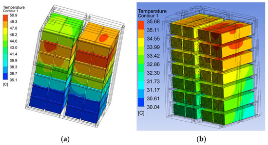 The optimized scheme of the heat dissipation for the energy storage power system, combined with schemes 4, 5, 20, and 21, had been simulated and analyzed by computational fluid dynamics software (ANSYS fluent). According to the air volume and temperature conditions of the heat dissipation scheme of the energy storage power box, the battery box module is cooled by using the inlet cold air temperature of 28 °C and the cold air volume of 800 m3/h. The inlet adopts the speed inlet boundary condition; the equivalent speed is 5.31 m/s, the outlet is the pressure outlet boundary condition, and the reference pressure value is set to 0 Pa. The internal wall of the energy storage power box is the non-slip coupling boundary condition, the external wall is the heat exchange boundary condition of natural convection with the external environment, the ambient temperature is set to 40 °C, and the heat transfer coefficient is set to 8 W/m2K. The fan inside the module is set to the pressure curve of the fan. The temperature distributions of the battery module for the optimized scheme and original scheme have been shown in Figure 14, respectively.