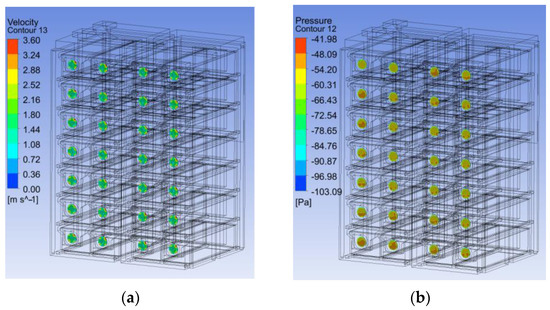 The velocity and pressure distributions for the independent fan surface (Scheme 5) of the battery module in the optimized scheme have also been simulated, and the results are shown in Figure 15a,b, respectively. The simulation results show that the velocity and pressure distributions of the exhaust fan for the 28 battery modules are uniform. The conclusion is that the ventilation air volume of each battery module is uniform for the optimized design scheme.