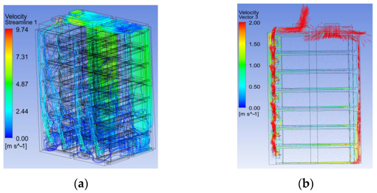 The airflow streamlines (a) and velocity vector (b) distributions inside the battery box of the optimized scheme.