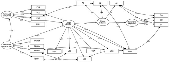 The above table provides an assessment of the impact of the potential variables and an assessment of the impact results (Table 7). In terms of impact results, the following conclusions can be drawn from the above table. The relationship between perceived usefulness and perceived ease of use on usage attitudes was above 0.05, with systematic coefficients of 0.287 and 0.701, respectively. This suggests that perceived ease usability has a high effect on usage attitudes [46]. The attitude toward use variable has a strong influence on human loyalty. Meanwhile, the “Summary Table of Model Regression Coefficients” shows all the measured relationships, which can be visualized in the above table, where “-” means that the item is a reference item and is not an output [46]. The table above indicates the size relationship if the size relationship is good, where the normalized load coefficient cost is essentially higher than 0.6.