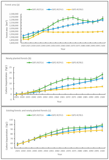 Forest carbon sequestration under different scenarios. (a) Change in forest area in 2020–2100 under the influence of different climate scenarios; (b) change in carbon sequestration of newly planted forests under different climate scenarios; (c) sum of future carbon sequestration of existing forests and newly planted forests in the future.
