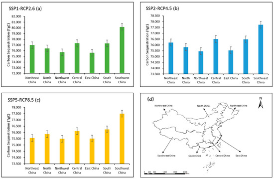 Changes in China’s forest carbon sequestration (TgC) in different regions from 2020 to 2060 under different scenarios (a–c). The forests in China were divided into seven regions in (d): Northwest China, including Gansu, Ningxia, Qinghai, Shaanxi, and Xinjiang; North China, including Hebei, Inner Mongolia, and Shanxi, as well as Beijing and Tianjin; Northeast China, including Heilongjiang, Jilin, and Liaoning; Southwest China, including Guizhou, Sichuan, Yunnan, and Tibet, as well as Chongqing; Central China, including Jiangxi, Henan, Hubei, and Hunan; East China, including Fujian, Anhui, Jiangsu, Shandong, Zhejiang, and Shanghai; and South China, including Guangdong, Guangxi, and Hainan.