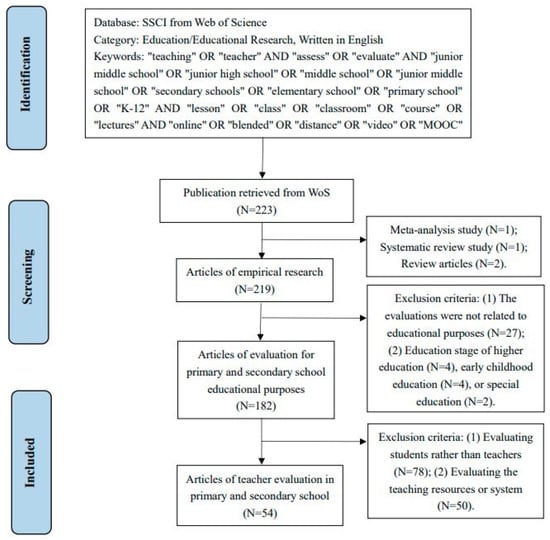 As our review focused on teacher evaluation, the first group of keywords were “teaching” OR “teacher” AND “assess” OR “evaluate”. The second group of keywords was limited to secondary and primary school teachers, including “junior middle school” OR “junior high school” OR “middle school” OR “junior middle school” OR “secondary schools” OR “elementary school” OR “primary school” OR “K-12” AND “lesson” OR “class” OR “classroom” OR “course” OR “lectures”. To further understand teacher evaluation in the pandemic period, we added “online” OR “blended” OR “distance” OR “video” OR “MOOC” as the search terms in the Web of Science database (https://www.webofscience.com/wos/woscc/basic-search, accessed on 31 October 2022). We limited our search results to SSCI-indexed journals because SSCI covered a wide range of journals across 55 social science disciplines []. It collected more than 3500 world’s leading scientific and technical journals [] which represented high quality. Many previous reviews [,,] often selected SSCI-indexed journal articles because these articles provided more detailed information and in-depth analysis. To ensure the articles we collected with high quality, our study limited the search result to SSCI-indexed journal articles. This study aims to capture the latest development and reveal the current situation of teacher evaluation. To achieve this purpose, we set the search period as a decade (from 1 January 2012 to 31 October 2022) to ensure the data set was adequate to observe the common characteristics of the articles, as suggested by the previous review [,]. The publication type was set as “article”. Additionally, the category was “education/educational research”, and a total of 223 articles were found.