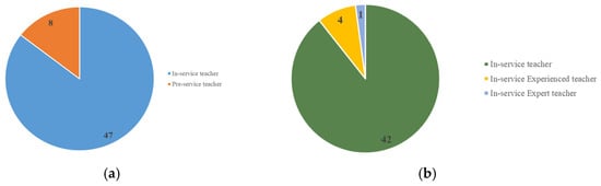 As shown in Figure 3a, in-service teachers were often selected as instructors in these studies. About 87.1% (47 out of 54) of the studies selected in-service teachers, 14.8% of studies assessed pre-service teachers, and one study selected both in-service teachers and pre-service teachers. As suggested by Hattie [], we further categorized in-service teachers into general in-service teachers, experienced teachers, and expert teachers. Figure 3b showed that most reviewed studies evaluated general in-service teachers, only four looked at experienced teachers, and one focused on expert teachers.