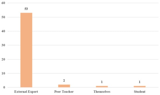 In addition, teachers value third-party evaluation more because the experts are more consistent in making judgments. External experts belonged to third-party evaluation. It represented fairness and high quality. Thus, teachers tended to take the results more seriously. The external experts could identify the problems that the teachers and schools were unnoticed and provided useful suggestions to help the teachers. For example, O’Brien et al. [] found that the group of teachers evaluated by external experts made more changes in their teaching, and their students improved more than the group that only used peer evaluation. From the perspective of teacher professional and sustainable development, it is necessary for teachers to share their knowledge about their teaching and to receive guidance from experts on relevant topics [].