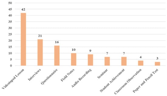 As shown in Figure 5, the videotaped lesson was the most popular method with 42 studies. This method allowed evaluators to observe and evaluate classroom teaching with validity and reliability. The evaluation conducted through interviews and questionnaires was the second and third popular method with 38.9% (21/54) and 29.6% (16/54), respectively. For example, Baricaua [] analyzed the transcripts collected through videotape recordings, non-structured questions, and formal written interviews to investigate the effectiveness of a professional development model. Moreover, ten studies applied the field notes, and nine used audio recordings for evaluation. The evaluation methods based on the student achievement and seminar had the same proportions with 13% (7 out of 54). We also observed that only four studies applied traditional classroom observation, and three evaluated teachers using paper and pencil tests.