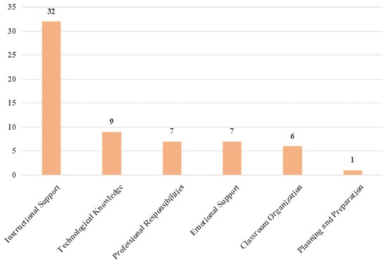 Emotional Support was also less likely to be evaluated. It represents teachers’ care and attempts to cater to students’ needs. Primary and secondary schools often have large class sizes. The average class size for primary school is 23.1 students for every class, while the class size is 24.3 for a secondary school in the United States. In the United Kingdom, the average class size increased to 22 in 2020 []. China also reported a large class with 38 students for primary school and 46 for junior high school []. The teacher–student ratio in a class indicates the teacher’s ability to manage a class, especially for distance learning. Smaller class sizes allowed students to receive more personalized feedback and more flexibility to use different instructional approaches from their teachers which ensures effective teaching is possible with individualized teaching []. However, students from large classes received less individualized attention from teachers, and it was difficult for them to keep up with the learning pace []. It posed challenges for classroom management as teachers struggled to care about every student in the class. Students were facing increasing mental health problems, especially during the pandemic period []. As suggested by Reinke et al. [], they found that teachers did not have sufficient knowledge and skills to support students with mental health needs. They lacked professional training and adequate support from the school [,]. Results indicated that emotional support from teachers helped create a positive learning environment that fosters academic success []. However, traditional teacher evaluations focused on academic outcomes. In this case, future evaluation should be more focused on the aspects of emotional support to deal with the problems of mental health. With the development of information technologies, many technological devices can be used to detect people’s emotions and cognition while the problem of privacy and data security would be a concern []. Consequently, children’s privacy, mental health, and ethical issues in technology use are other possible reasons for restricting studies on Emotional Support.