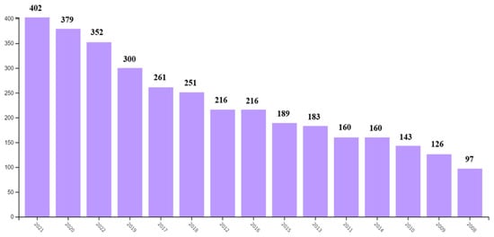 The distribution of publications focused on the use of technology in K-12. Adapted from “Web of Science”, accessed on 1 January 2023. (https://www.webofscience.com/wos/woscc/analyze-results/f616a956-9d15-4779-888d-aa38548024bd-67837633).