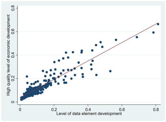 To analyze the relationship between the level of data factor development and the level of high-quality economic development, Stata16 is used to draw scatter plots and fitted curves for the data factor development index measured in this paper and the high-quality economic development index, as shown in Figure 1.