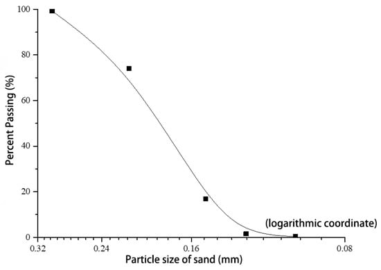 The test material is the sand foundation. The test background is the offshore wind power foundation constructed in the sea area near Fujian, China. The foundation weight is used as the load to study the inhibition range of sand foundation liquefaction. In this regard, standard Fujian sand was used to simulate the marine sand environment. Table 1 and Figure 1 show the physical parameters and the gradation curve of the test material, respectively.
